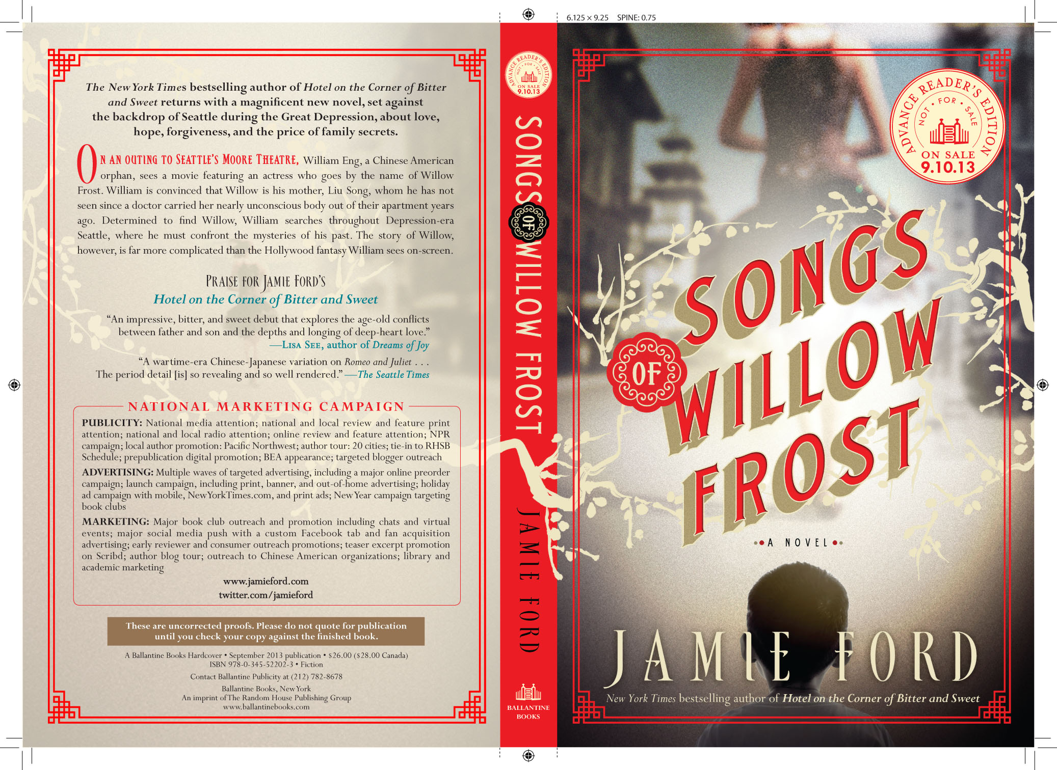 The wait for Songs of Willow Frost’s Advanced Reader edition is slowly drawing to an end. New York Times bestselling author Jamie Ford has released the cover image. More information on the release to come—as well as his speaking engagements this fall and next spring.